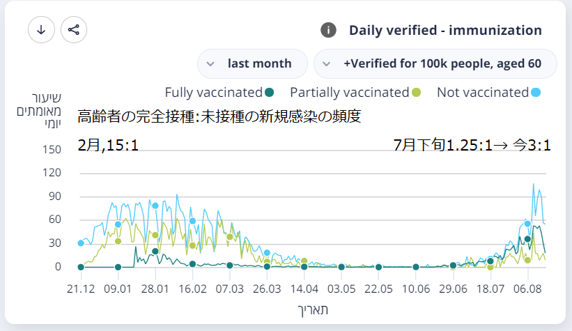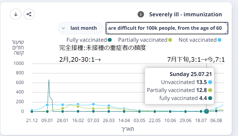 同じ人数の高齢完全接種者と高齢未接種者の中の重症者の頻度は2月には25:1程だったのが7月下旬に一時3:1程まで縮まりまた7:1程まで回復(図2