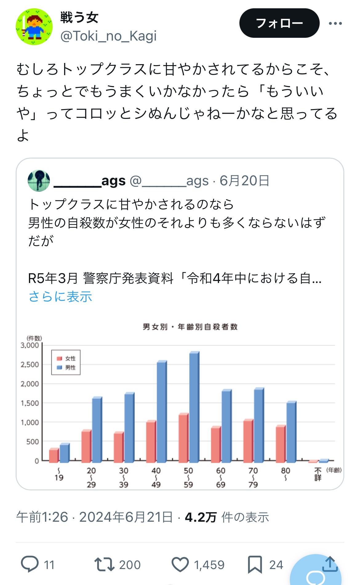 男が自殺率高い理由は普段から甘やかされててメンタル劇弱でなんかあったらすぐ死ぬから