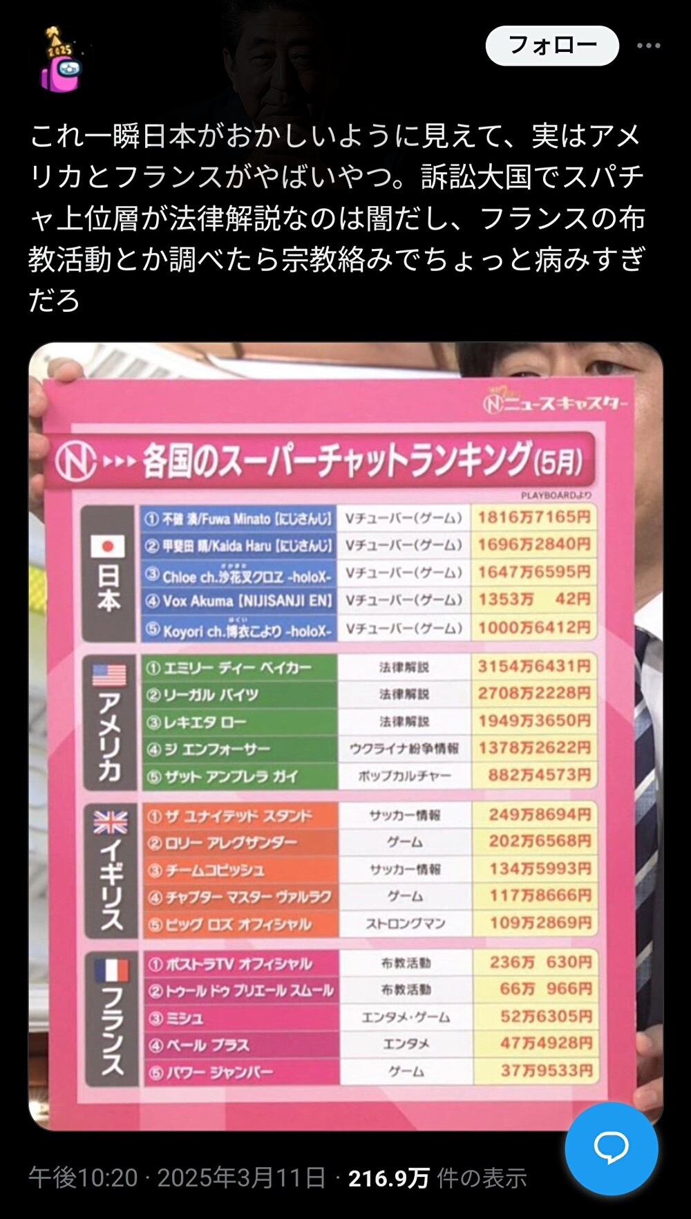 識者「スパチャランキング日本だけおかしい?あのさぁ…」