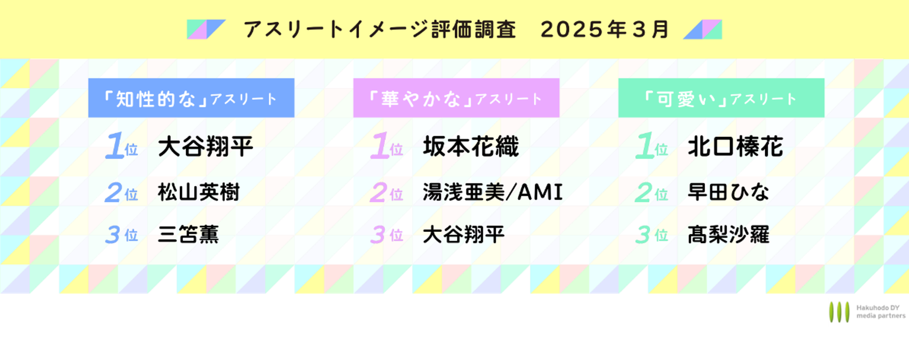 「知性的な」アスリートは大谷翔平、松山英樹、三苫薫「華やかな」は坂本花織、湯浅亜美/AMI、「可愛い」は北口榛花、早田ひな