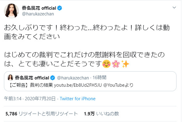へずまは4月29日のポストで「アンチのいきすぎた行動が目立っていたので」とつづり、弁護士に依頼し、複数の裁判を起こすことになったという趣旨のことを記述。高校生ユーチューバーのゆたぼん(16)が先月、誹謗中傷をめぐる裁判で「約70万円で勝訴しました」などと報告したことを引き合いに、へずまは「ゆたぼん家族が最近70万勝訴したみたいだけど自分は全部で1000万ぐらい回収できそうな気がする。別件でも警察が動いているしアンチ成敗編に突入だ!!!」と書いた。
