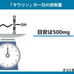 また、体内に含まれるタウリンの合計量は、体重の0.1%相当とされています。体内でも作られますが、加齢とともに減少する傾向にあります。一日の摂取量の目安は、500mg程度とされています。摂取しすぎた分は体外に出されるため、特に上限値は決まっていませんが、