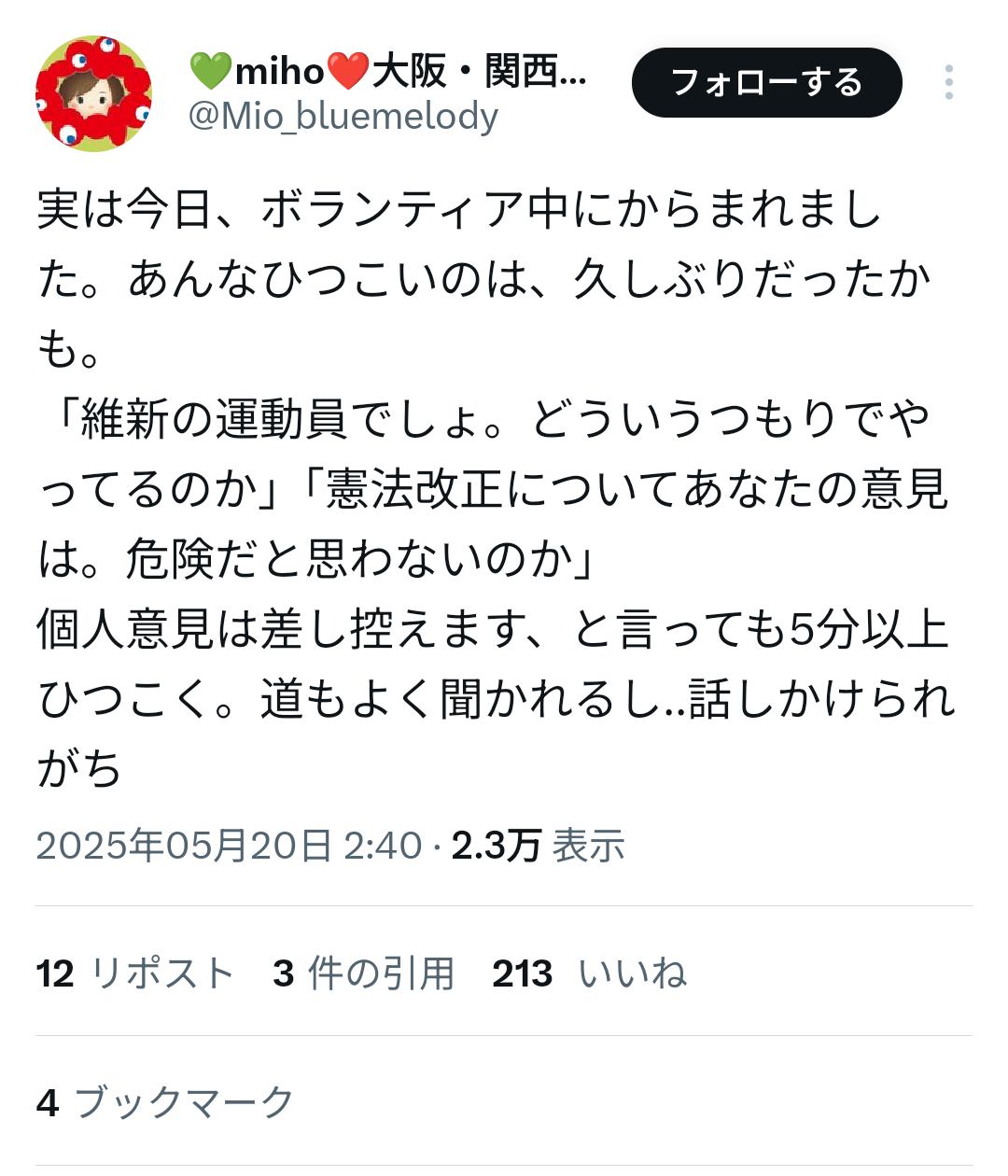 万博ボランティアさん、日本共産党員に絡まれる「お前は維新の運動員か!憲法9条をどう思うか答えろ!!」