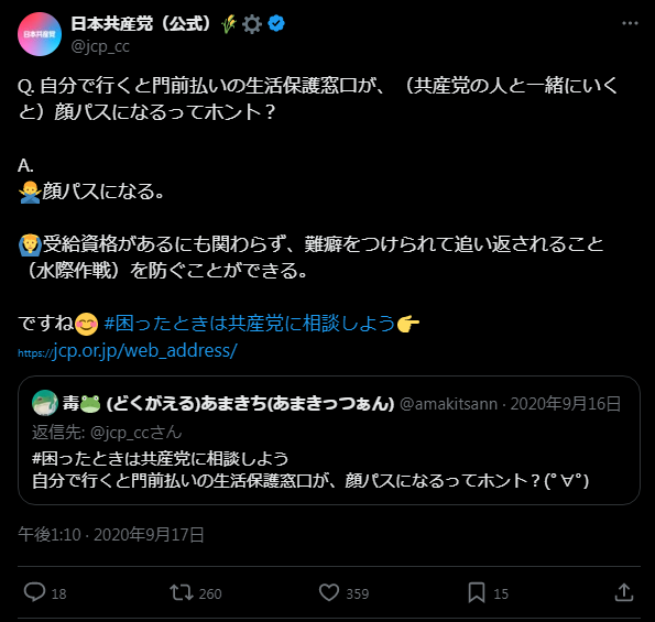 「生活保護を申請する時に、共産党の議員さんと一緒に行くと申請が通るって本当ですか?」→共産党公式アカウントが快く回答