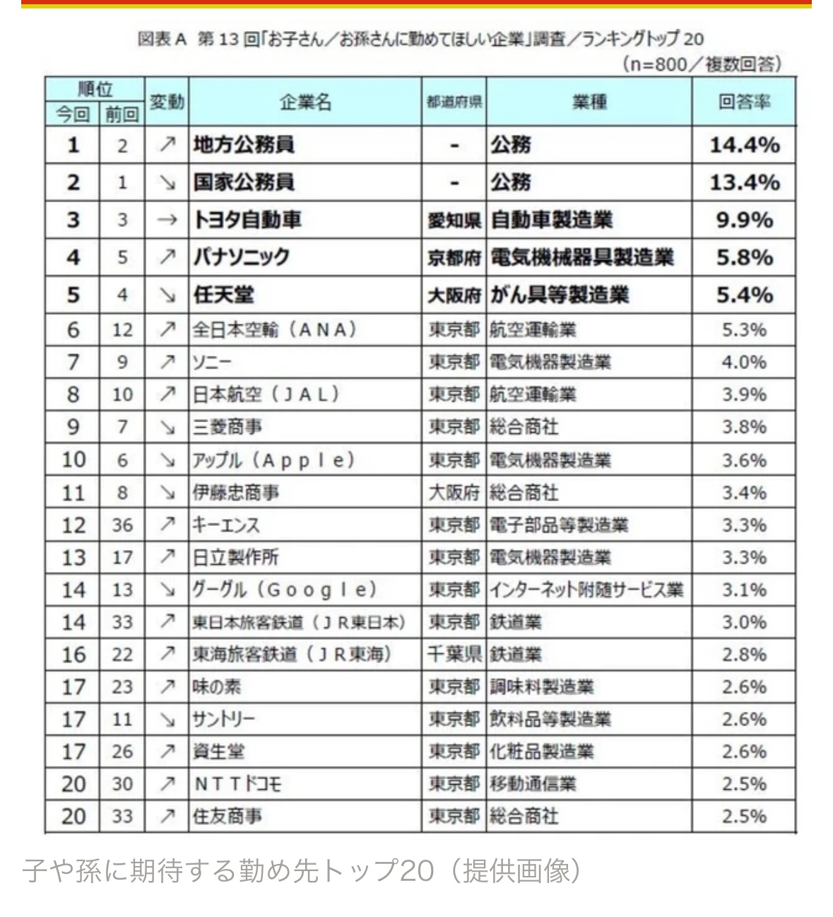 子や孫に入ってほしい勤め先ランキング、1位はみんな大好き公務員!2位も公務員!安定志向が影響か