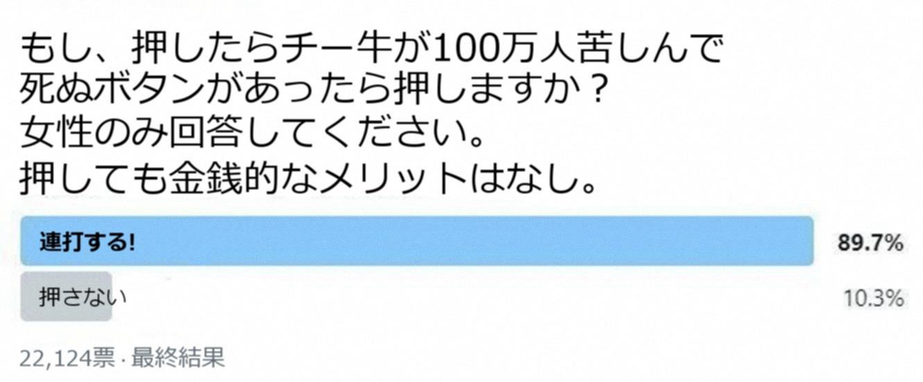 「女性だけに質問です。チー牛100万人が苦しんで死ぬボタンがあったら押しますか?金銭的なメリットはありません」→結果