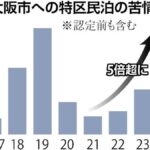 全国の特区民泊の約9割が集中する大阪市で、制度への住民の反発が目立っている。コロナ禍後の訪日客の急増に伴って開業が相次ぎ、市への苦情総数は3年間で5倍超になった。市はプロジェクトチームで対策を検討する。(南部さやか、中西千尋)