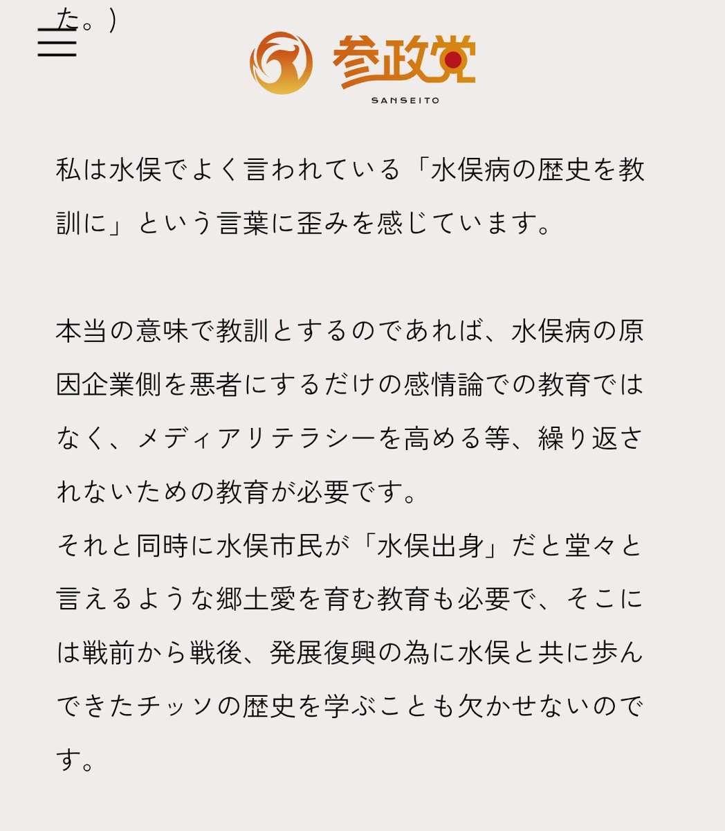 水俣市の参政党議員、まじで郷土愛のためにチッソを悪く言うのは止めようって言い出してて愕然とする。