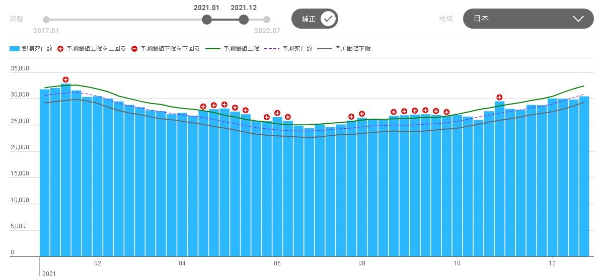 正しい超過死亡のグラフは↓こちら。感染が全国に拡大した第4波(3月1日~6月20日)と第5波(6月21日から12月16日)で超過死亡が出ている