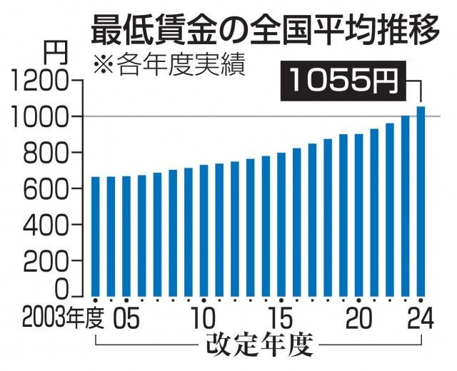共同通信最低賃金(時給)の2025年度改定を巡る議論が11日から、厚生労働相の諮問機関・中央最低賃金審議会で始まる。石破茂首相が「20年代に全国平均1500円」との目標を掲げてからは初。現在は1055円のため、実現には25~29年度の5回にわたる改定で、7%程度ずつ上げる必要がある。初回の水準がどうなるのか、8月上旬までには決まる見通しだ。