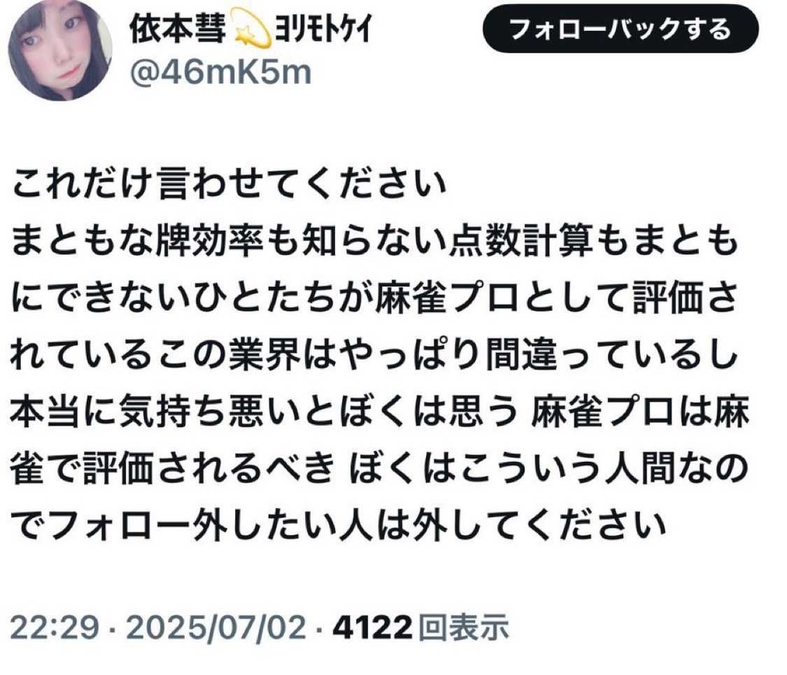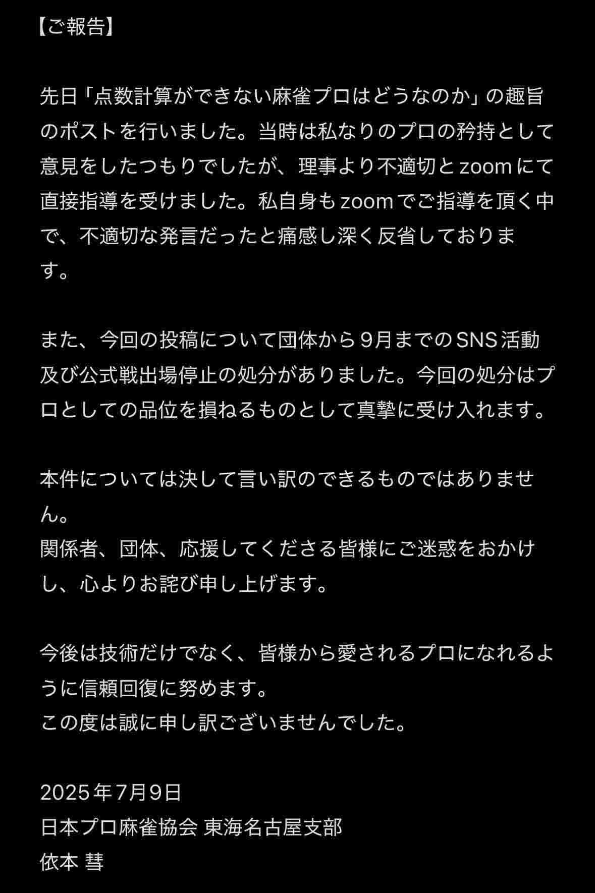 先日「点数計算ができない麻雀プロはどうなのか」の趣旨のポストを行いました。当時は私なりのプロの矜持として意見をしたつもりでしたが、理事より不適切とzoomにて直接指導を受けました。私自身もzoomでご指導を頂く中で、不適切な発言だったと痛感し深く反省しております。