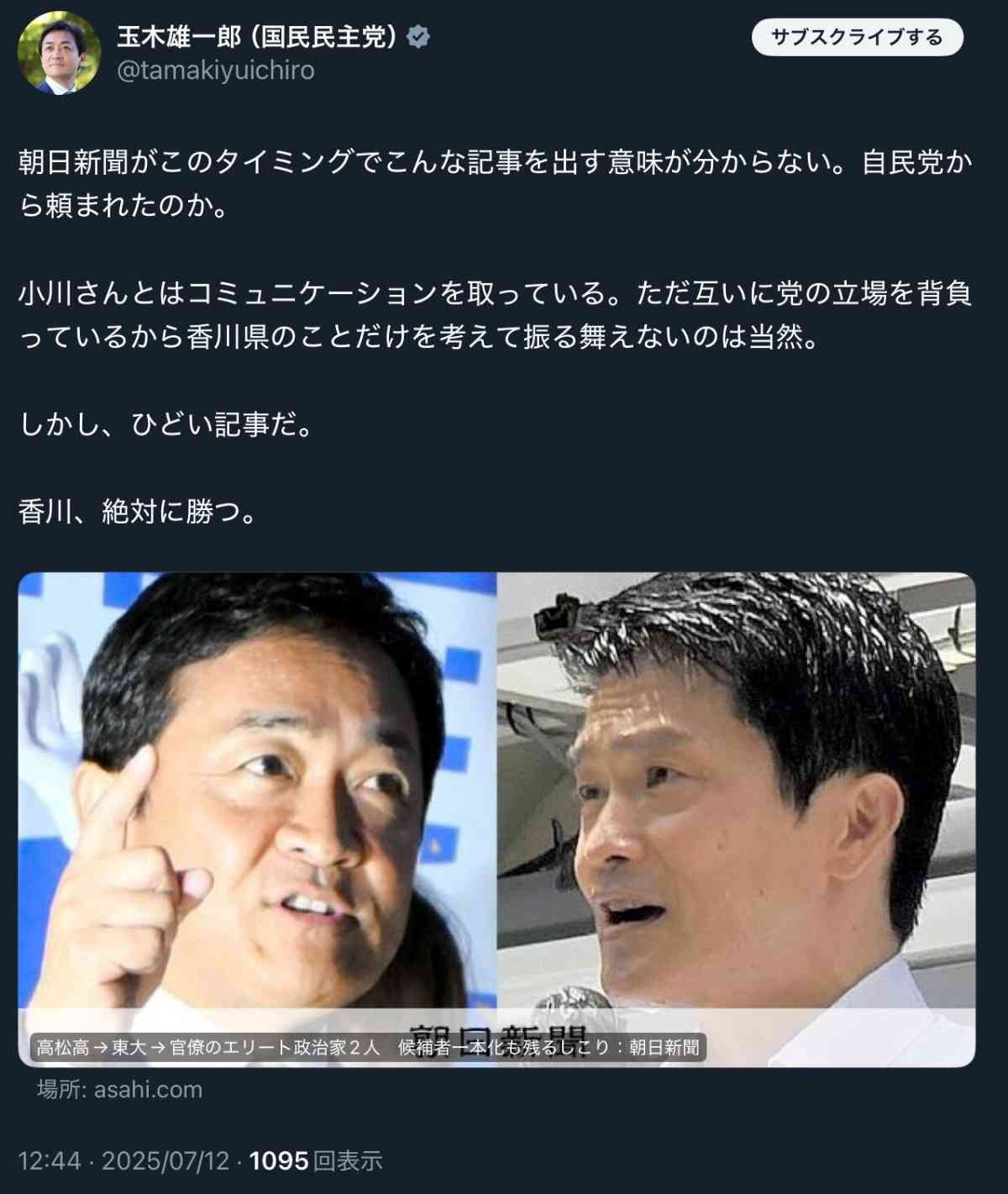 小川さんとはコミュニケーションを取っている。ただ互いに党の立場を背負っているから香川県のことだけを考えて振る舞えないのは当然。