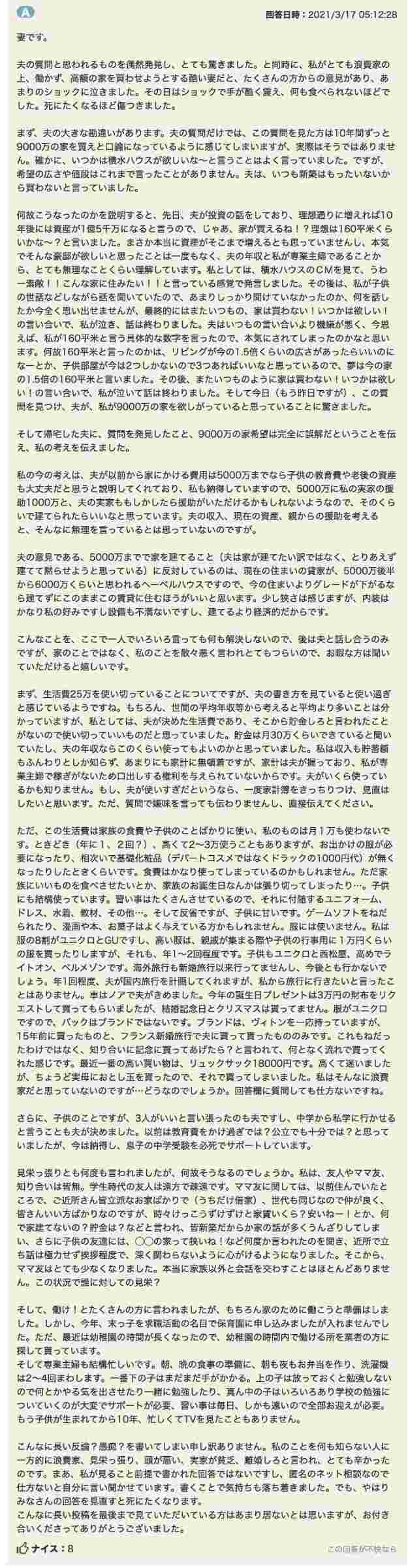夫の質問と思われるものを偶然発見し、とても驚きました。と同時に、私がとても浪費家の上、働かず、高額の家を買わせようとする酷い妻だと、たくさんの方からの意見があり、あまりのショックに泣きました。その日はショックで手が酷く震え、何も食べられないほどでした。死にたくなるほど傷つきました。