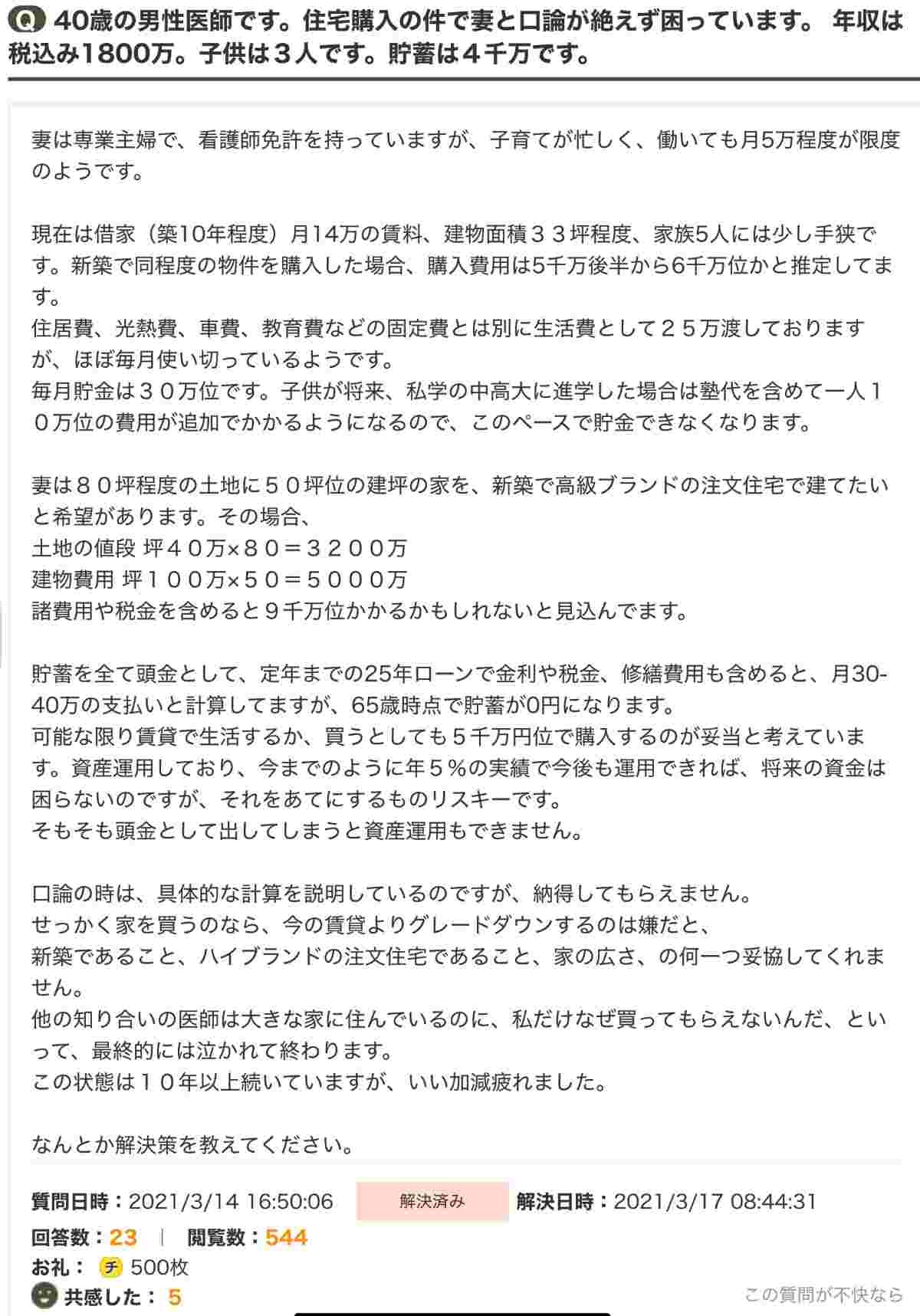 40歳の男性医師です。住宅購入の件で妻と口論が絶えず困っています。 年収は税込み1800万。子供は3人です。貯蓄は4千万です。