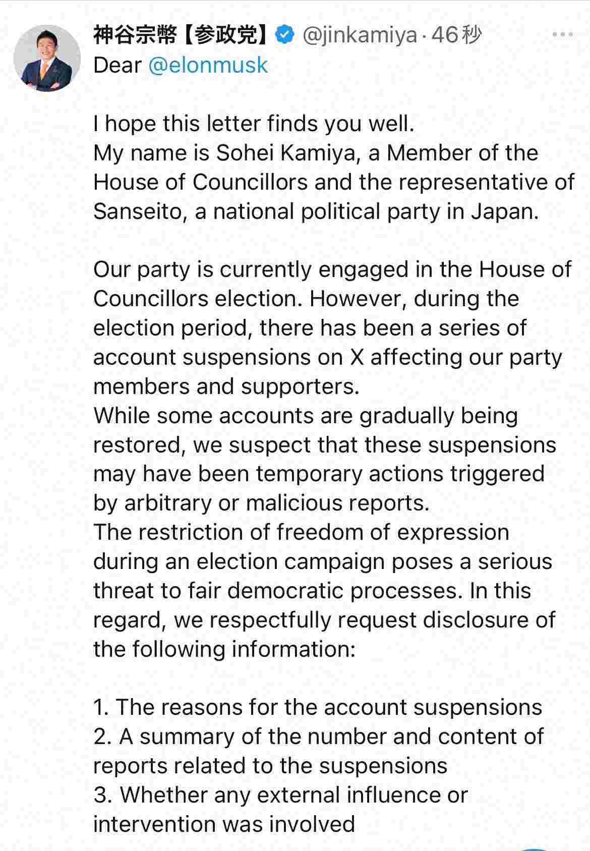参政・神谷代表、党関係者のX凍結巡りマスク氏に開示要請の投稿(毎日新聞)