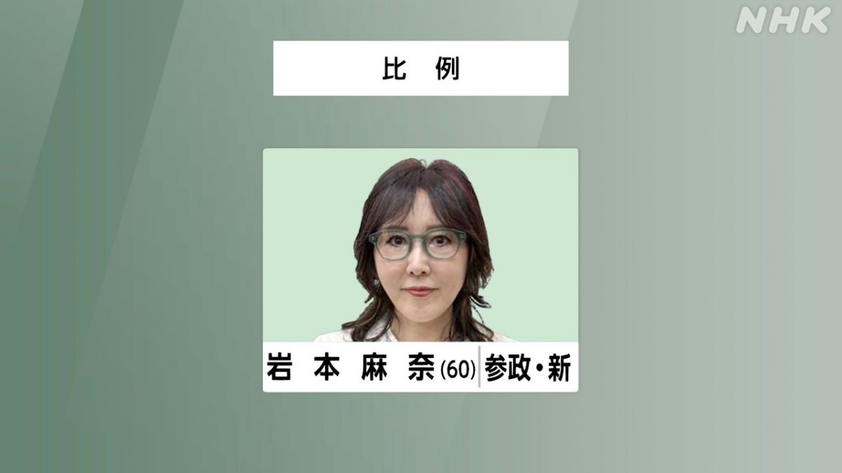 参議院選挙の比例代表で、参政党の新人、岩本麻奈氏の当選が確実になりました。岩本氏は60歳。