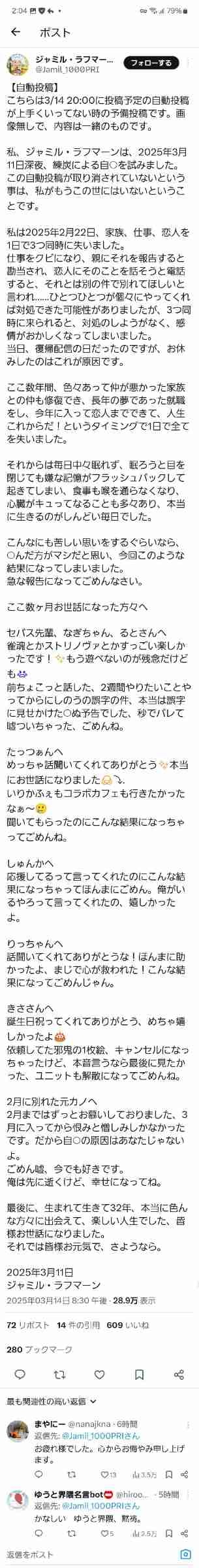 同社は公式Xに「ジャミル・ラフマーンの訃報について」と題した文書を掲載。