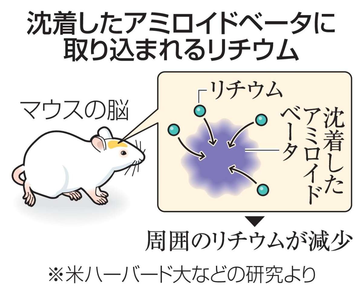 マウスにリチウムを減らした餌を与えると、認知機能が低下、アミロイドベータ沈着も進んだ。リチウムを加えた水を飲ませると、アミロイドベータの沈着や記憶力の低下が抑えられた。