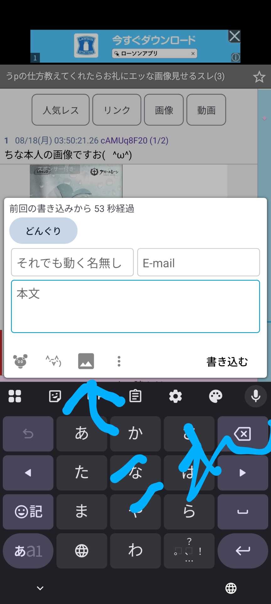 書き込み押して4角に山みたいなアイコン押して上げたい画像選んでアップロード