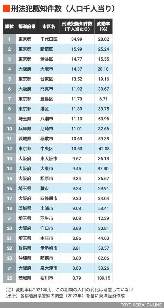 地域の治安を見る指標の1つに「人口当たり刑法犯認知件数」がある。今回は、市と特別区(東京23区)を合わせた全国815市区を対象に、