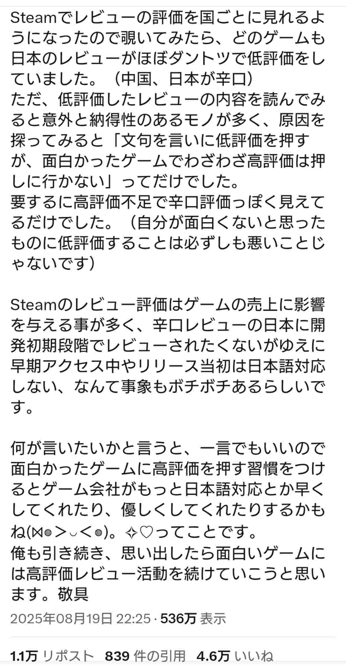 Steamユーザーの少ない日本人の評価なんて塵芥だぞ