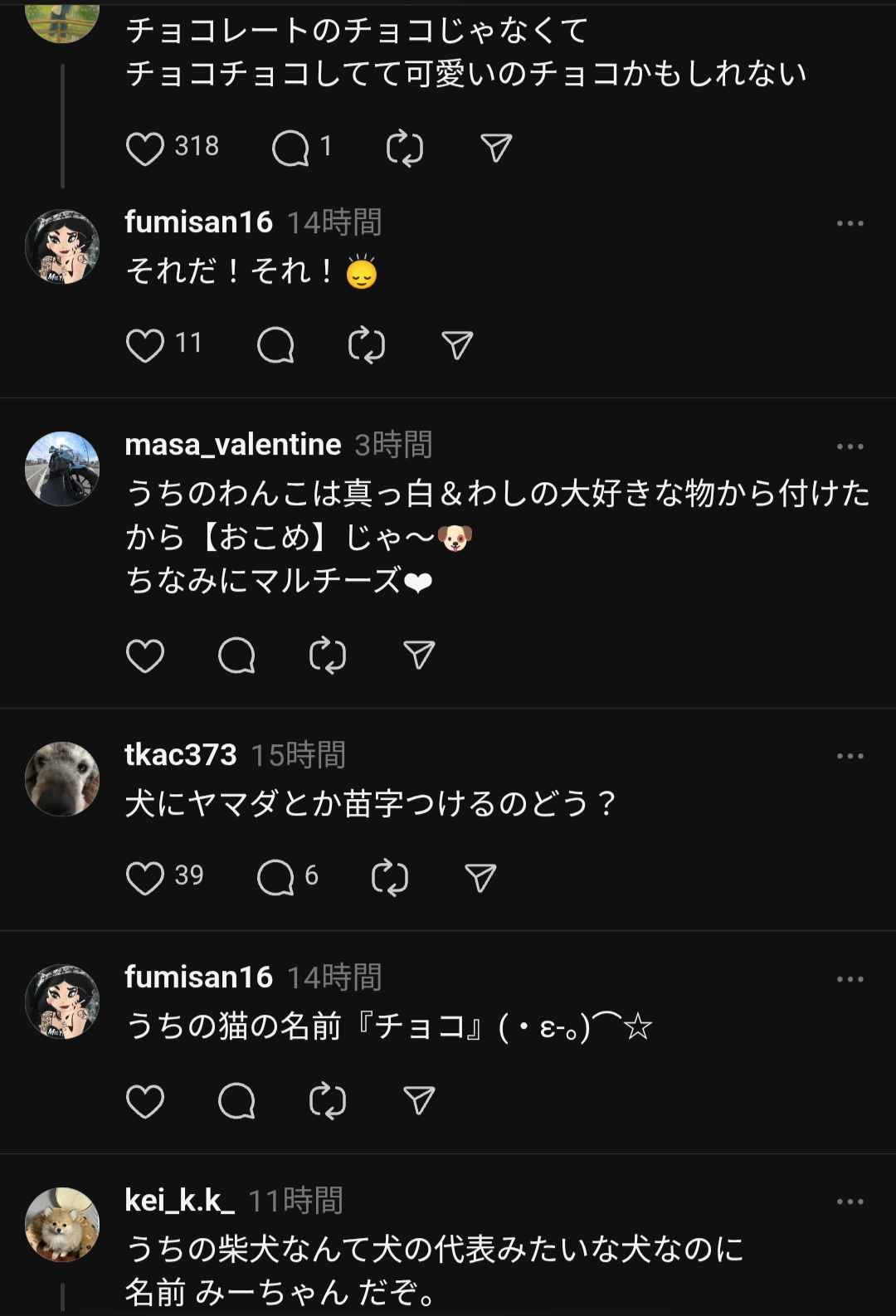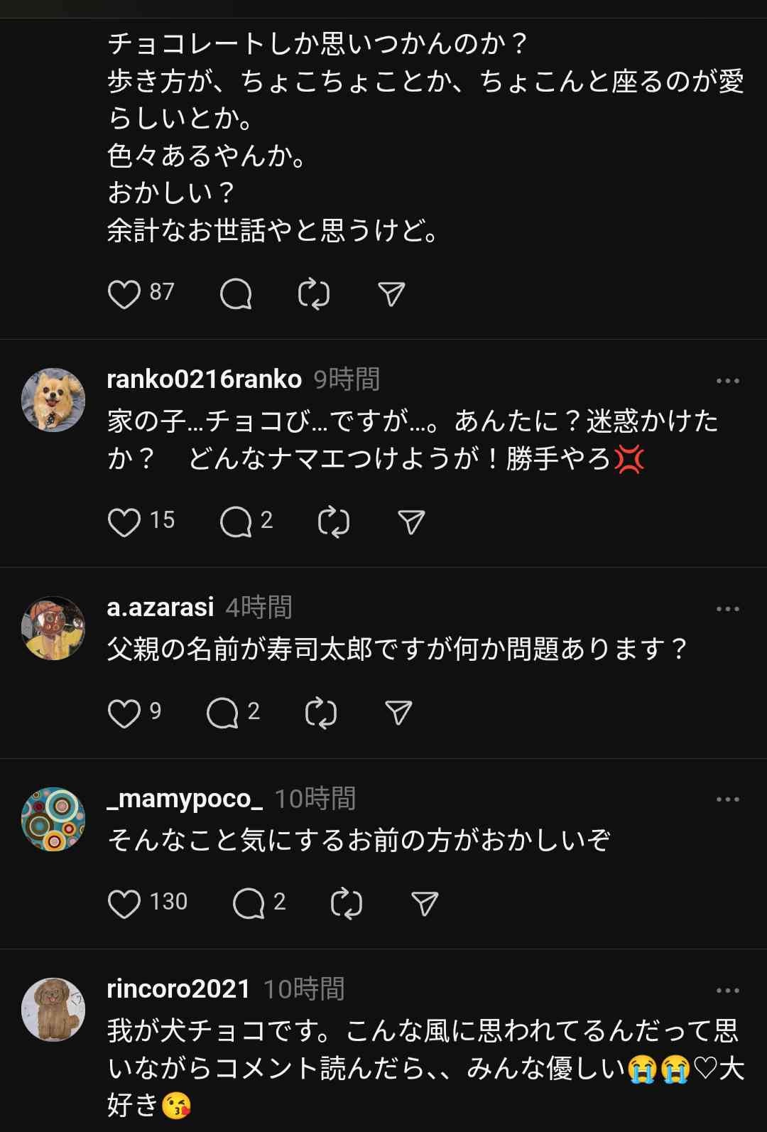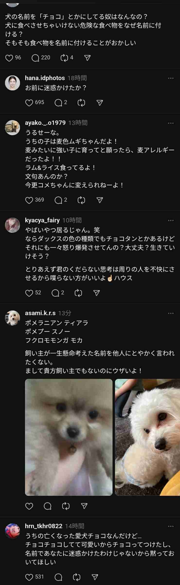 チョコとか食べ物の名前つけられた犬は恥ずかしい飼い主を持って他の犬に馬鹿にされてるかもね