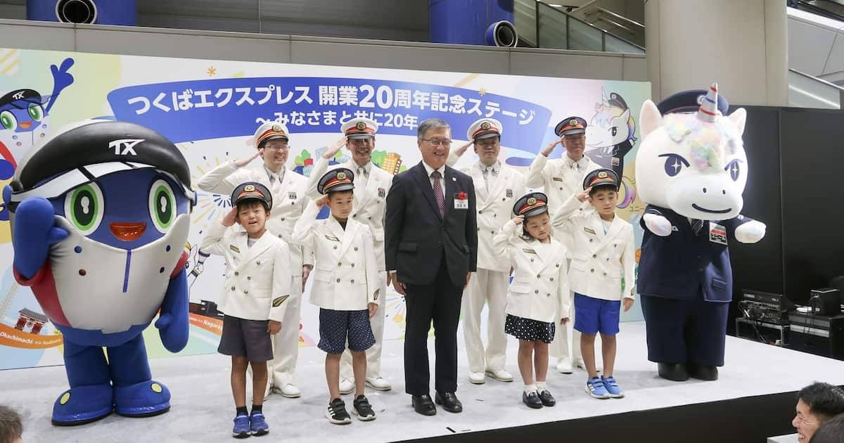 茨城県つくば市と東京・秋葉原を結ぶつくばエクスプレス(TX)を運営する首都圏新都市鉄道(東京)は24日、開業20周年を記念し、秋葉原駅構内で式典を開いた。「こども一日駅長」に選ばれた小学生4人が特別ラッピング車の出発式に臨み、「出発進行!」と合図を出して門出を祝った。記念式典には鉄道愛好家や家族連れら約100人が参加。同社の新しいマスコットキャラクター「ユニール」や特別ラッピング車がお披露目され、集まったファンを沸かせた。