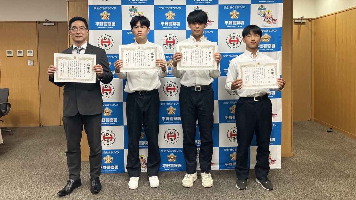 8月27日、大阪府警平野警察署から感謝状を送られたのは、中崎正太郎さん(49)と、東住吉総合高校の前島海人さん(17)・高野健志さん(17)・片岡怜さん(18)です。
