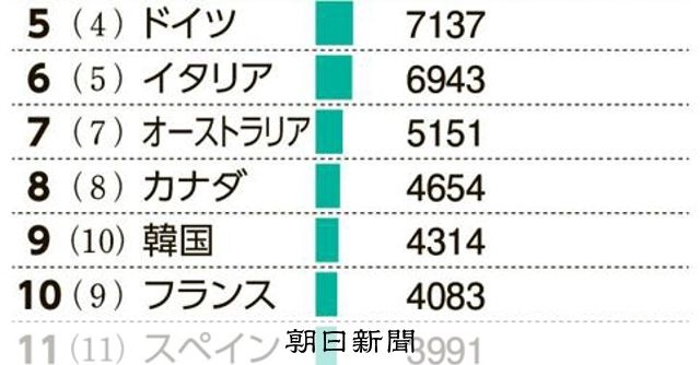 「注目度の高い論文」として引用された回数が上位10%に入る論文数(トップ10%)では13位。トップ10%論文数は質の高い研究の指標とされ、日本は過去最高の3位から下落傾向が続く。https://www.asahi.com/articles/ASS8922C5S89ULBH007M.html
