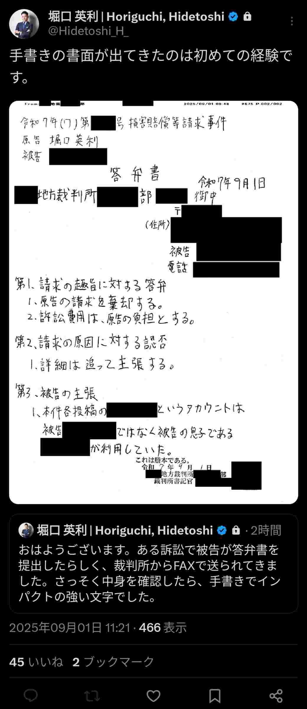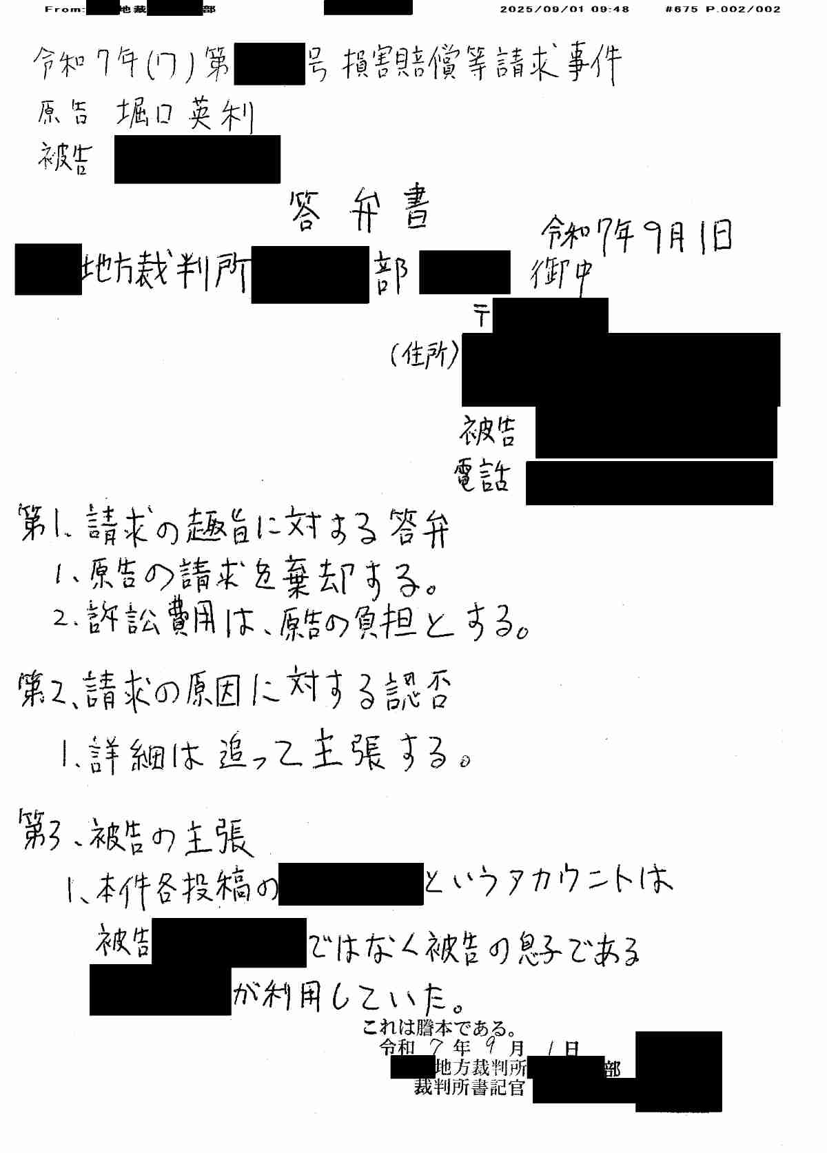 訴えられたのは暇アノンの親で手書きで弁明しているのね