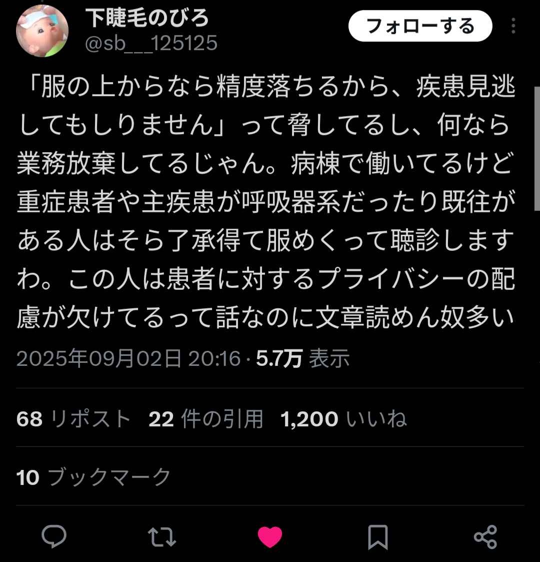 呼吸器内科とかだと服の上からだとわからんしっていわれる