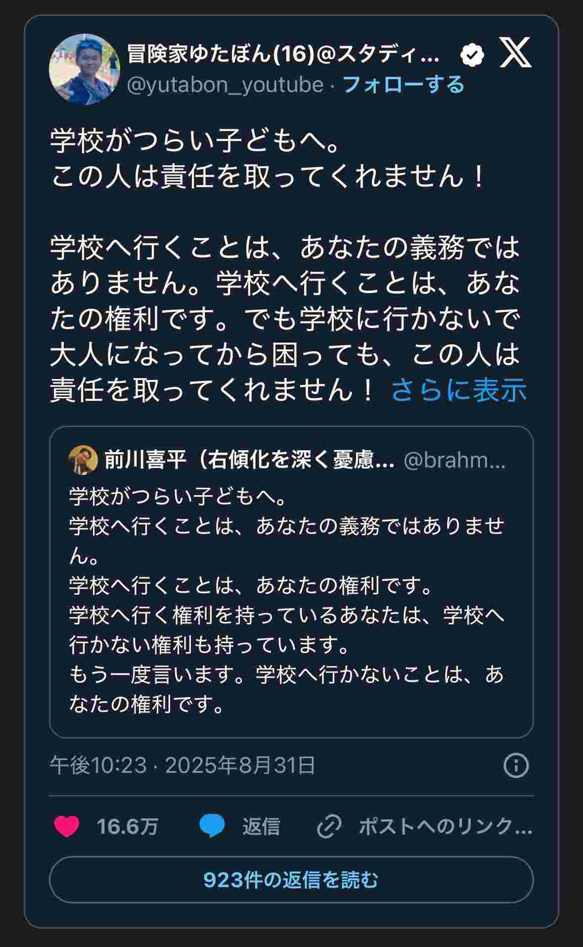 人気YouTuberのゆたぼんさんが、8月31日にXを更新。