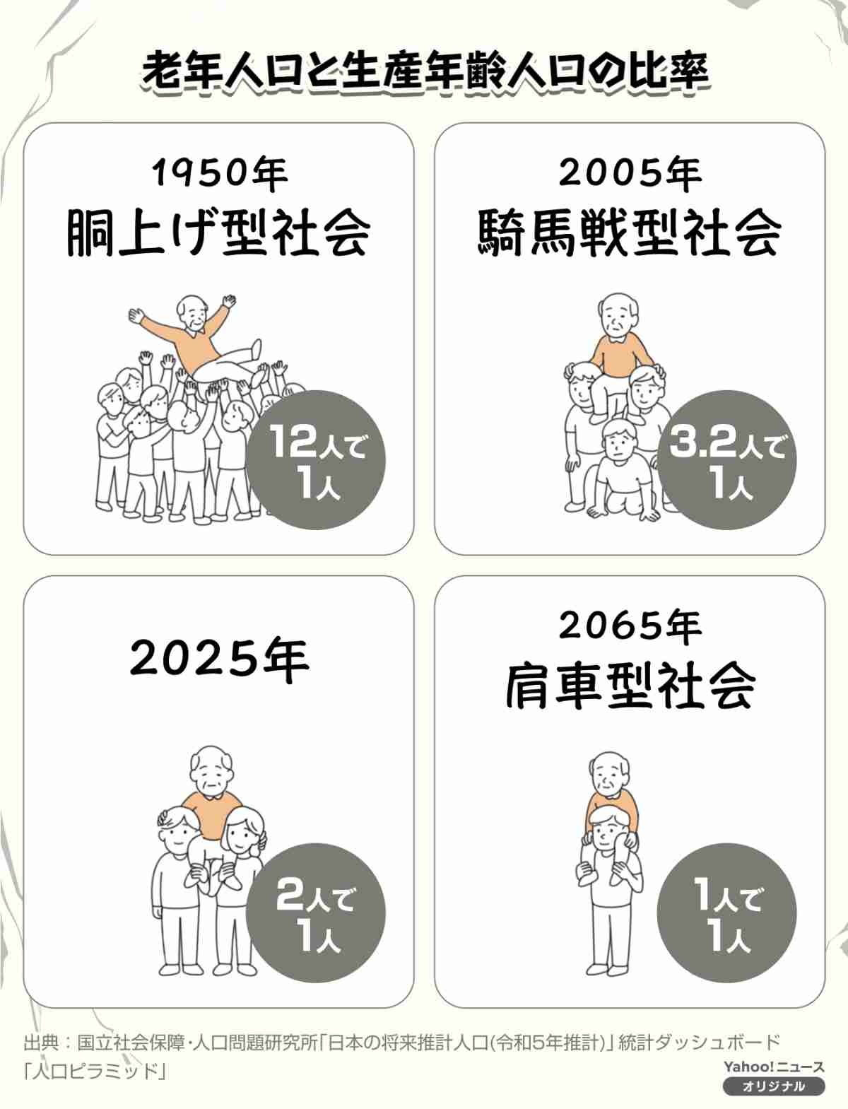 1950年代、人口ピラミッドが富士山型になっていたころは十数人で1人の高齢者を支えていたが、2025年では2人で1人を支える構図に。