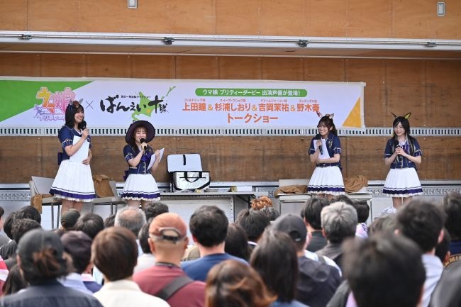 ばんえい十勝(帯広市主催)と人気コンテンツ「ウマ娘プリティーダービー」とのコラボイベントが13、14の両日、帯広競馬場で開かれた。14日は、午後のキャラクターの声優らによるトークショーに道内外か…