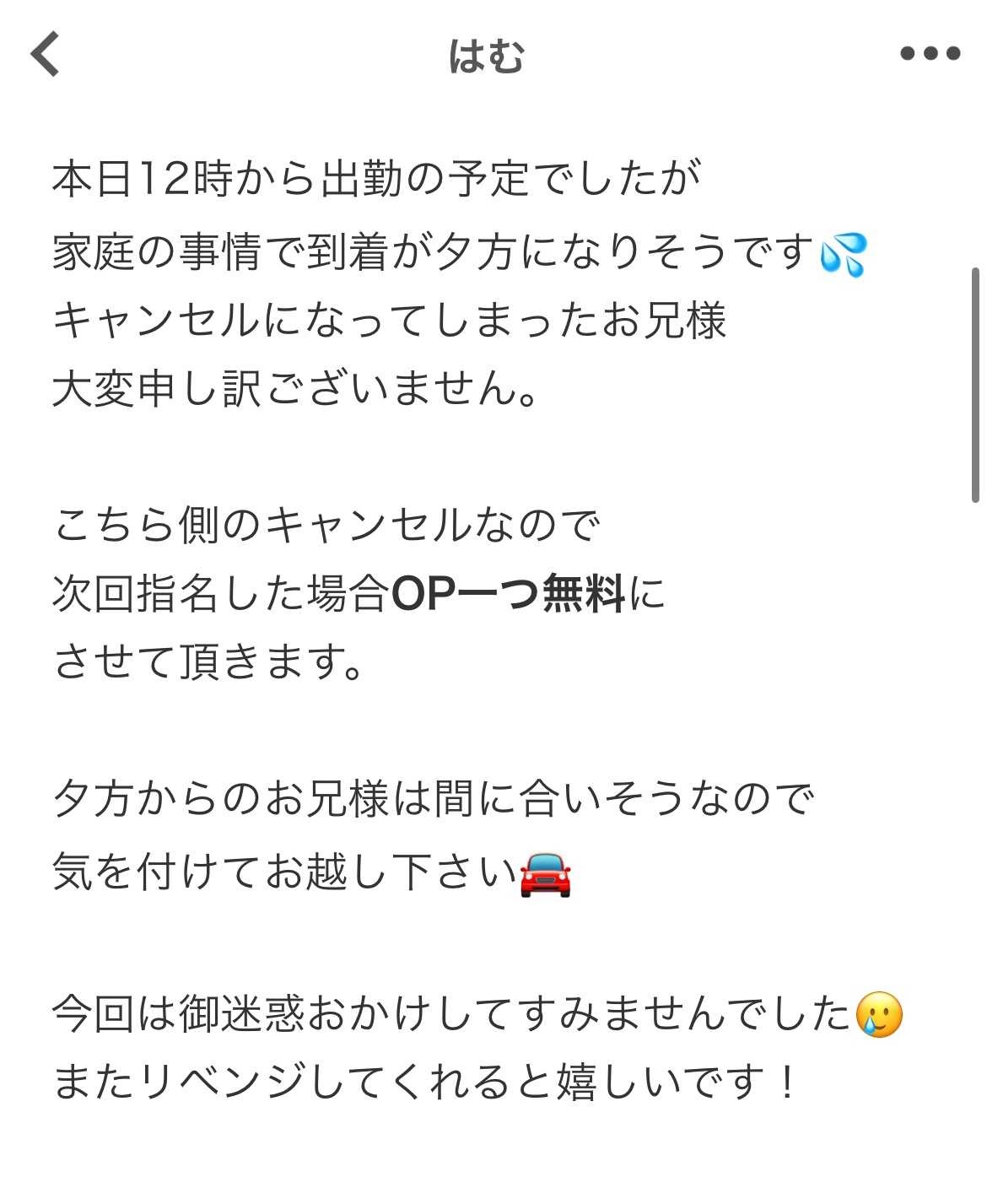 本日12:55頃、御店のボーイの方からご連絡をいただき、はむさんの到着遅延により予定変更の可能性があること、また私の予約がキャンセルになる可能性が高い旨を伺いました。その際、結果が分かり次第折り返しいただけるとのことでした。