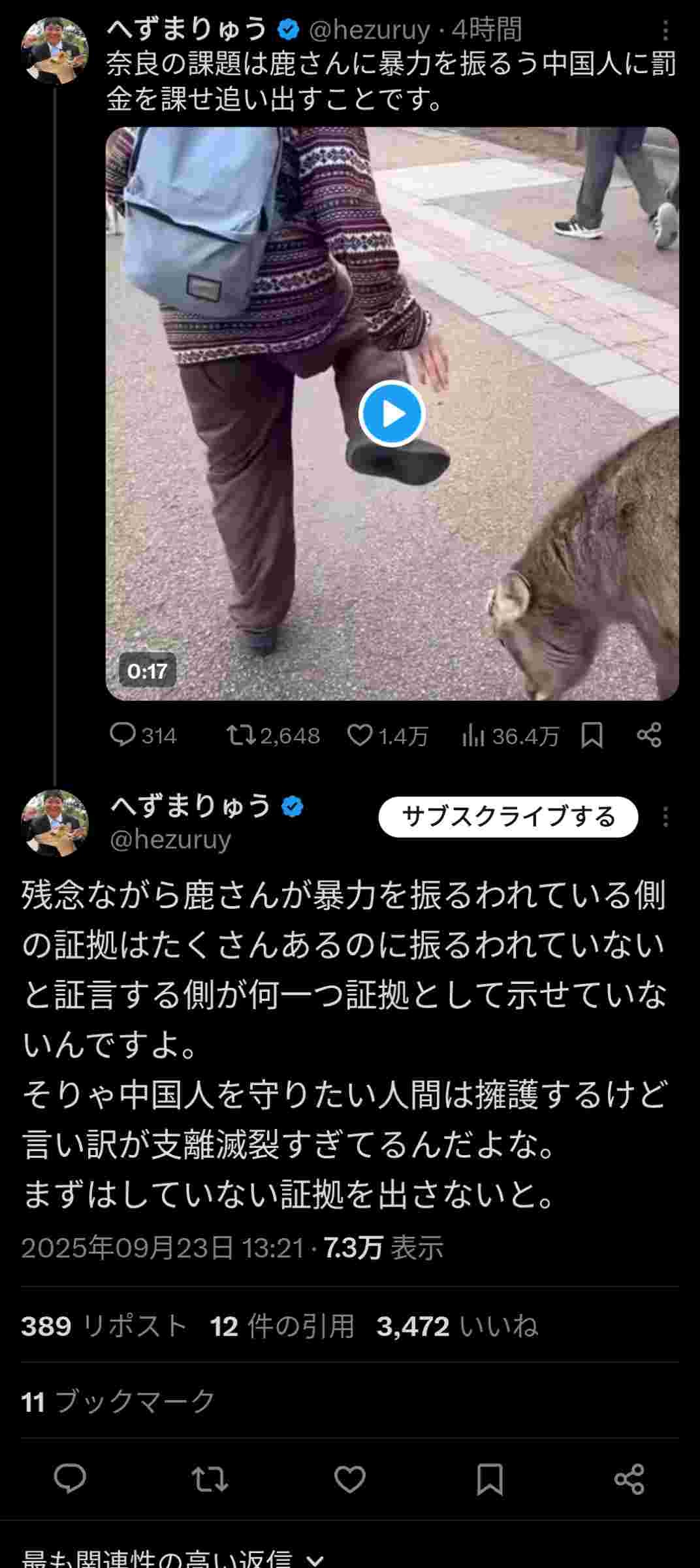 まずはしていない証拠を出さないと。 高市早苗氏、総裁選演説で「奈良のシカ」蹴る外国人に怒り 「へずまりゅう?」連想の声も...本人も反応自民党総裁選に出馬している高市早苗前経済安全保障担当相が2025年9月22日、所見発表演説会で「奈良の女」としての思いを語り、注目を集めている。「奈良のシカをですよ、足で蹴り上げる、とんでもない人がいます」高市氏は演説冒頭、「皆様、こんにちは。高市早苗、奈良の女です。大和の国で育ちました」と切り出した。「奈良の女として...www.j-cast.com
