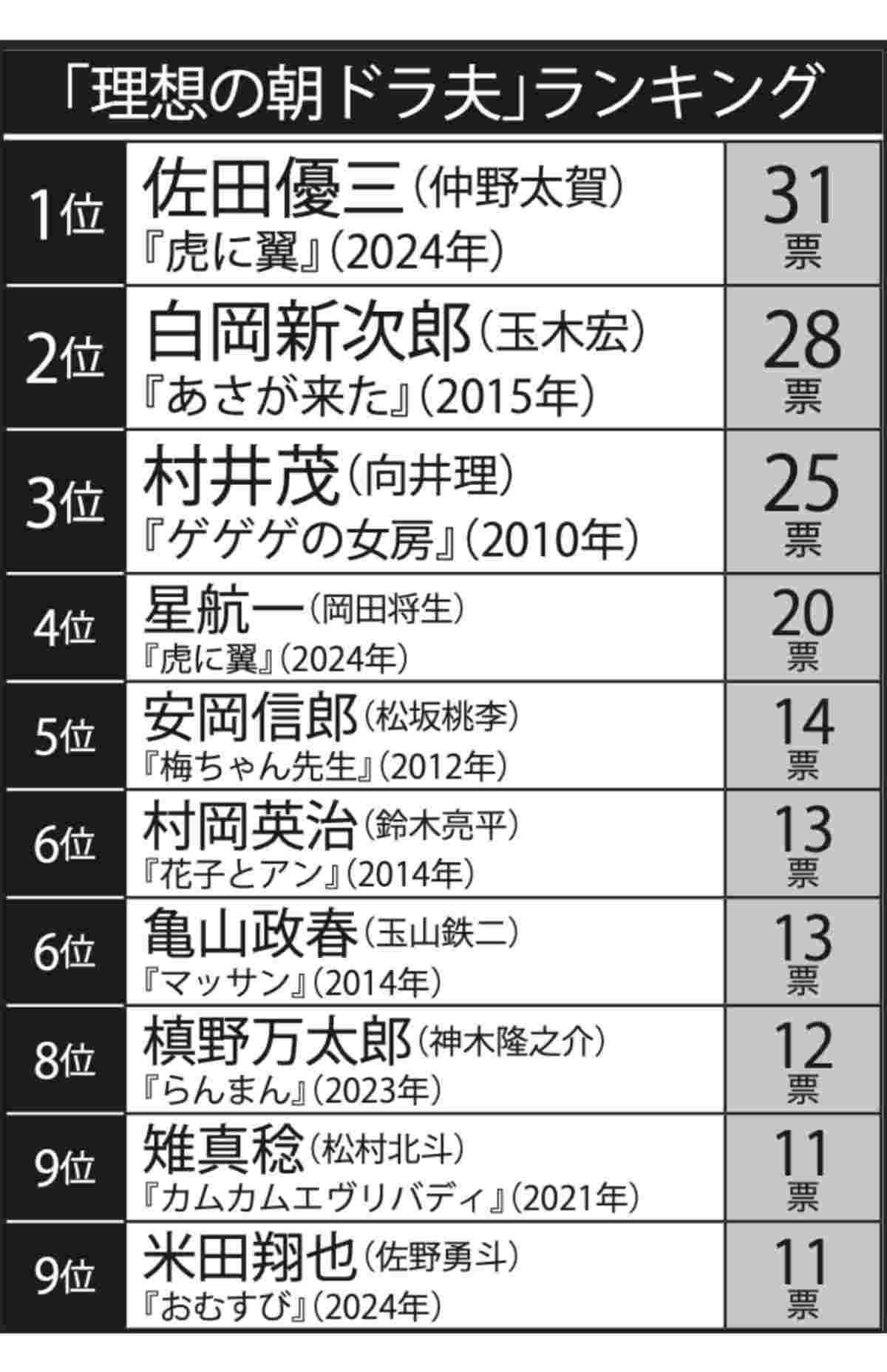https://news.yahoo.co.jp/articles/8996eb3db9c1648a7d118a53de8d3603ef75b111?page=1■30代~60代女性500人にアンケート!理想の朝ドラ夫ランキングTOP10