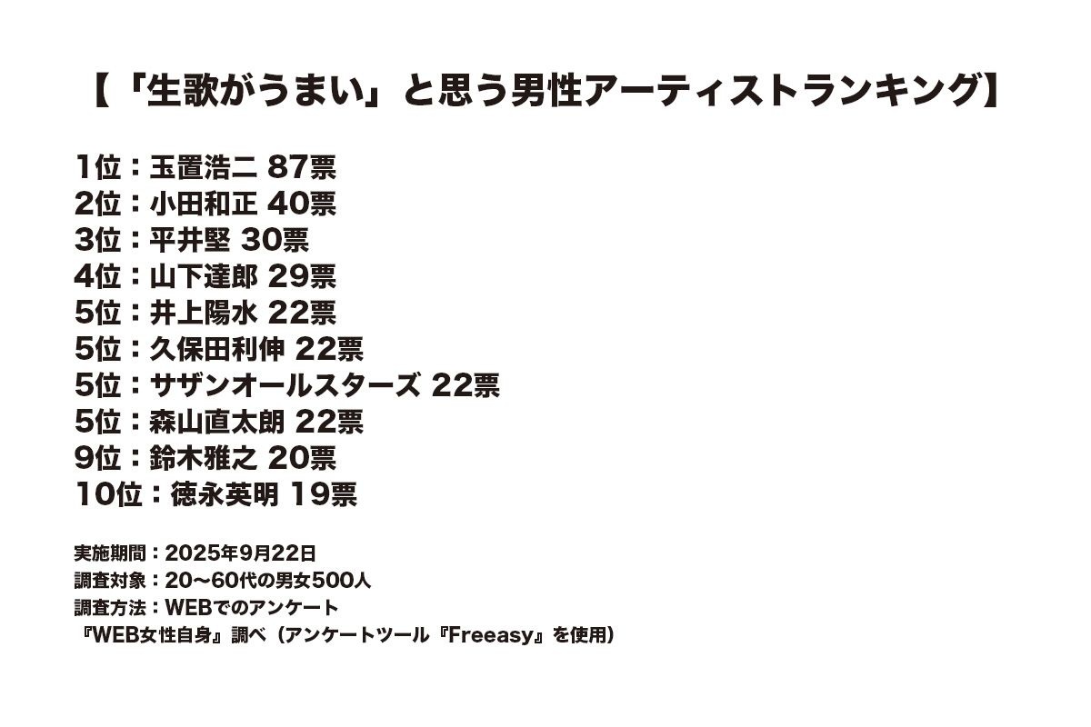 そこで本誌はWEBアンケートツール「Freeasy」にて、20~60代の男女500人を対象に「生歌がうまいと思う男性アーティスト」についてアンケート調査を実施した。