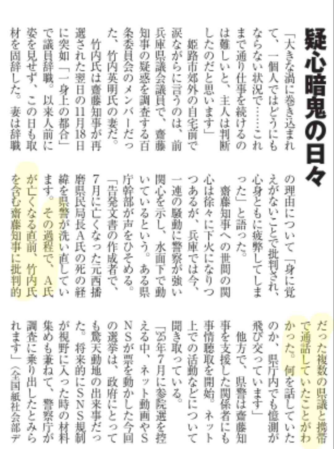 週刊現代によると、県民局長は自殺直前に後にジサツする竹内県議などともに数人の県議と電話で話していた