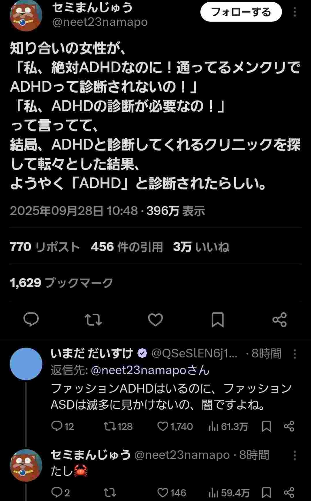 医者にまぁADHDだと思いますけどってIQとか心理検査やる前に言われたわ、本物は幼少期からイカれたエピソード積み重ねて来てるんよ