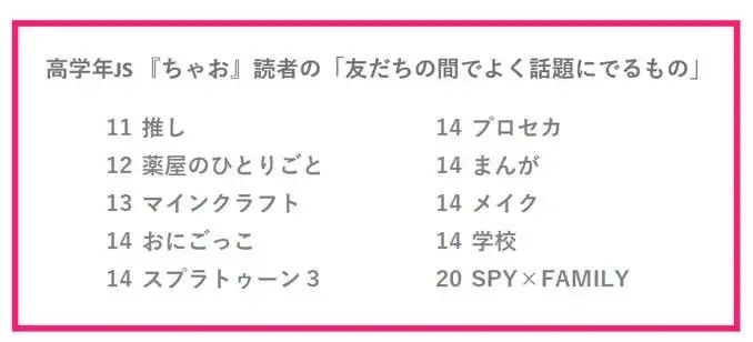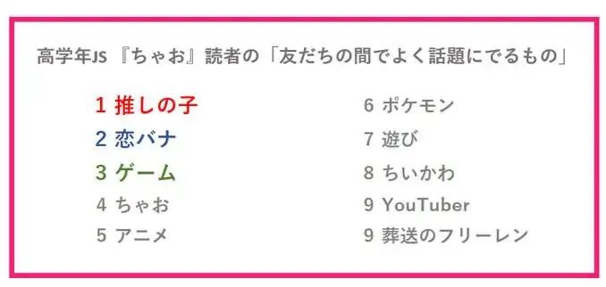 女子小学生(JS)のリアルな本音を定期リポートする小学館の「JS研究所」が実施したアンケート「2023年下半期JSトレンド調査」の結果が発表された。同社の少女マンガ誌「ちゃお」の高学年JS読者を対象としたアンケート「友達の間でよく話題にでるもの」で、「週刊ヤングジャンプ」(集英社)で連載中のマンガ「【推しの子】」が1位に選ばれたことが分かった。