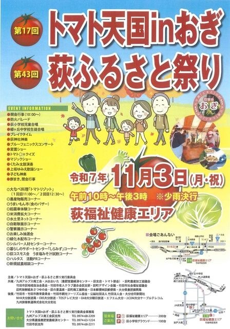 九州有数の高原野菜の産地である大分県竹田市荻町で、トマト天国inおぎ・荻ふるさと祭りが今年も開催される。場内では、名物の大なべ料理「トマトリゾット」の実演販売や、食のバザー、お楽しみ抽選会、農産物の即売なども行われる。ステージイベントでは、子ども神楽、地元小中学校の児童生徒による合唱、荻げんきこども園の防火パレード等盛りだくさん。また、餅まき等も行われる。
