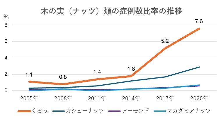 クルミやカシューナッツなどのナッツ類のアレルギーを起こす人が急増している。消費者庁の調査によると、2011年以降の12年間で10倍に増え、子どもを中心に重症化リスクも高まっている。日常に潜むナッツアレルギーの危険と、社会の対応に迫った。