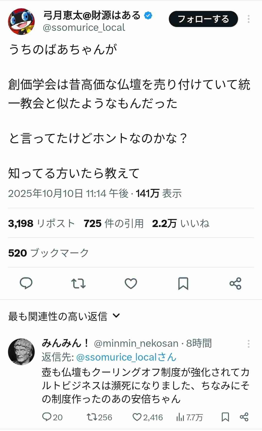 創価学会も統一教会と同類って話が盛り上がってるの、いよいよ世間も気づき始めたってことやろか?高市さんもニッコリやな