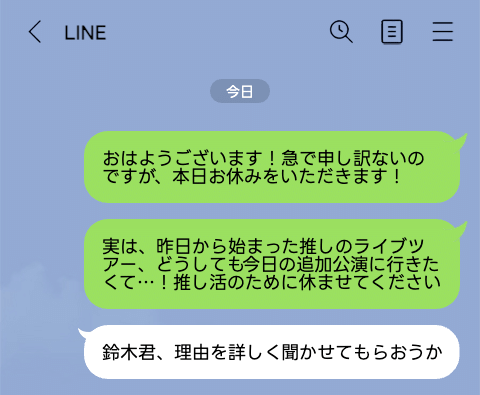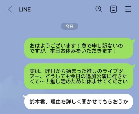 「実は、昨日から始まった推しのライブツアー、どうしても今日の追加公演に行きたくて…!推し活のために休ませてください」(正直すぎる…!)