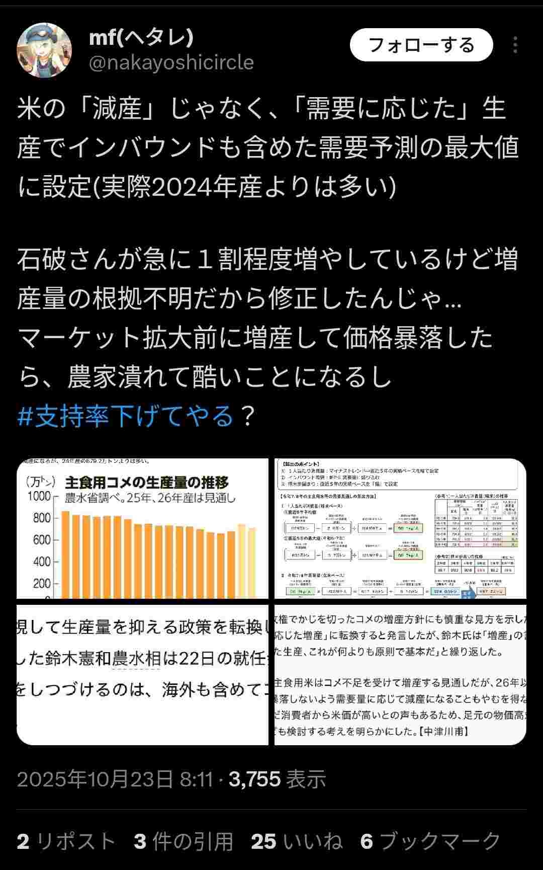 野良ッピが農林水産省のコメ不足の分析否定するなよ