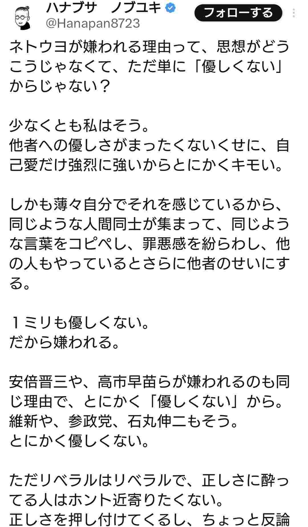他のポストからして移民絶対推進派みたいだからそりゃネトウヨは優しく無いって評価だわな