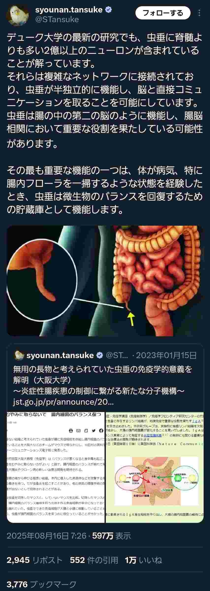 いやそんなに重要なら今までだって虫垂炎を切った患者は早死にするとか健康に重大な支障出るみたいな話になってるはずでしょ
