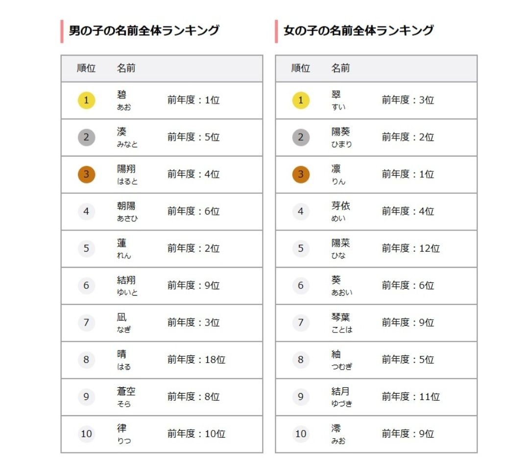 男の子の「碧」は2年連続の1位、女の子の「翠」は初めての1位です。 https://news.yahoo.co.jp/articles/f5b4b291f27be6ad5757025fad90caf1758eb66d