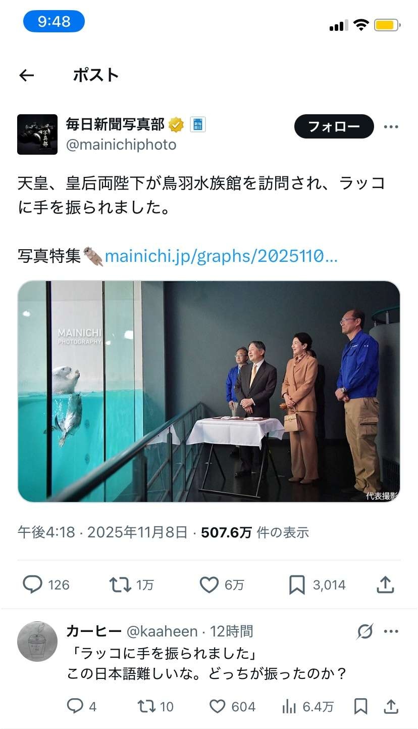 写真みたら手を振ってるのはラッコで、むしろ天皇皇后は手を前で組んでるから、ちょっと面白い解釈ができちゃうところがいいところだな